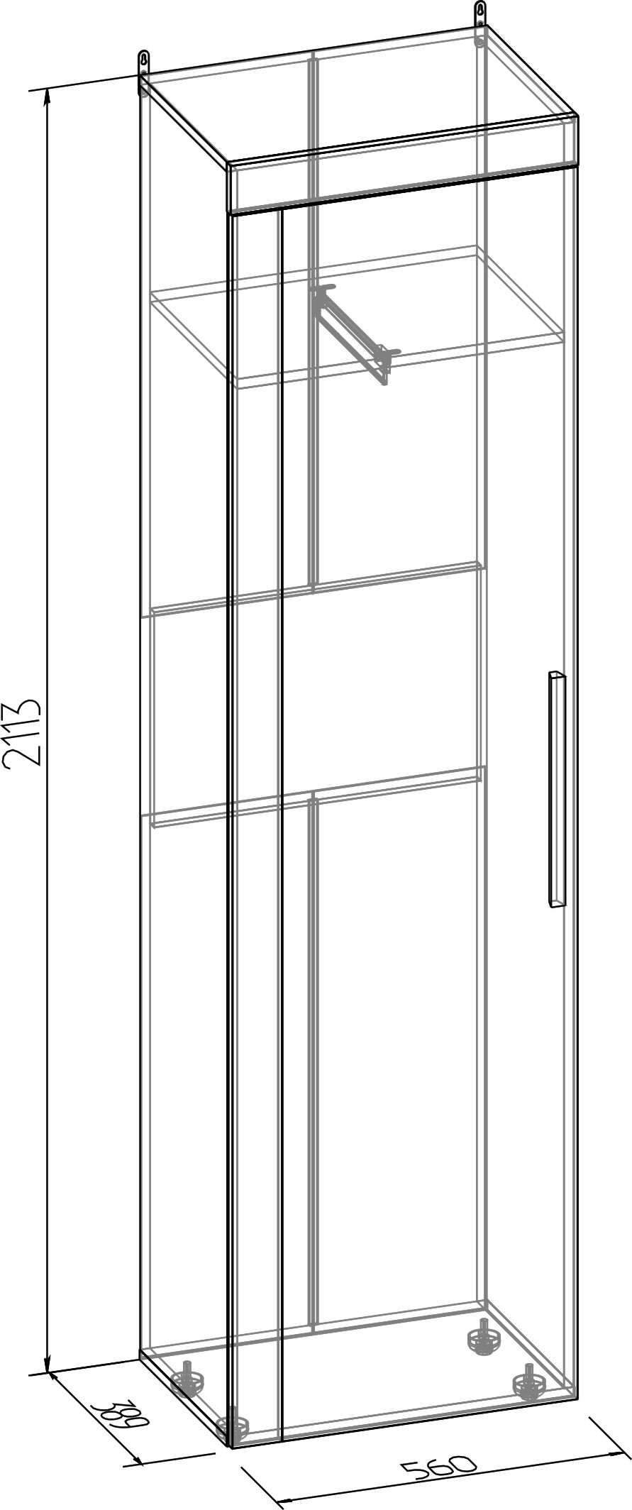 Однодверный платяной шкаф с полкой и выдвижной штангой предназначен для хранения длинной и короткой одежды на плечиках. По желанию покупателя может быть дополнен модулем Леон 6 Полки. В такой комплектации (с тремя дополнительными полками) выдвижную штангу можно не устанавливать, либо сократить свободное пространство под ней.