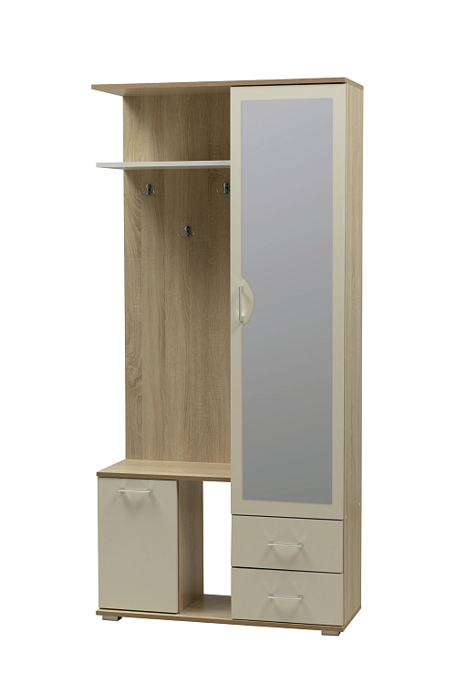 Компактный, современный шкаф, способный заменить полноценную прихожую. Благодаря небольшим размерам он занимает мало полезного пространства, поэтому его можно поставить даже в маленькое по площади помещение. В комплектацию изделия входят открытая вешалка с прочными крючками, небольшая секция с распашной дверцей, полка для головных уборов, два выдвижных ящика, расположенных под большим отделом с глухой створкой. На последней имеется прямоугольное большое зеркало, которое позволяет человеку видеть себя почти в полный рост. Ещё одна интересная деталь – узкая ниша, разделяющая малую тумбу и выдвижные ящики.