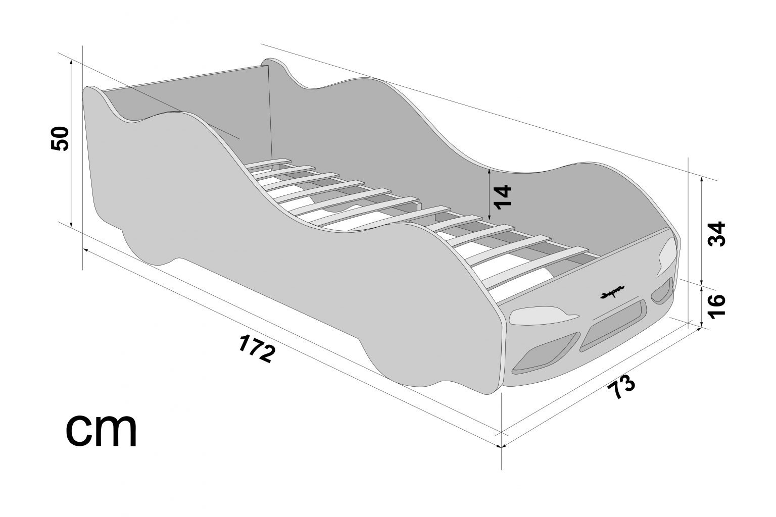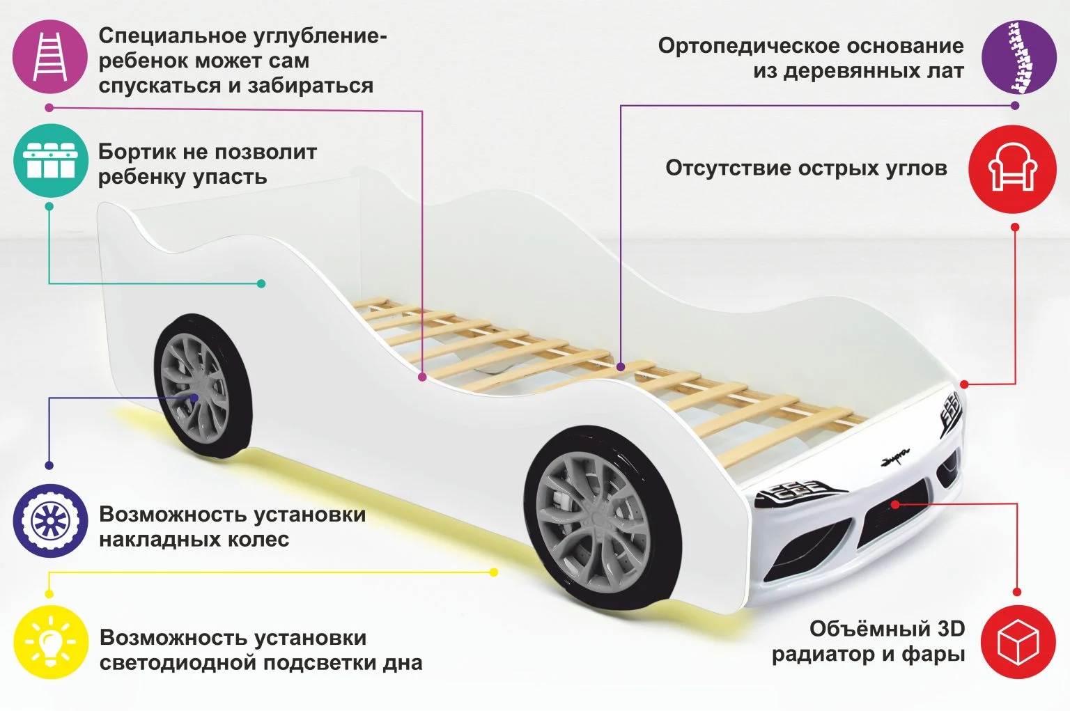 Каркас кровати выполнен из экологичного ЛДСП класса эмиссии Е1, соответствует всем стандартам качества. Кровать оборудована объемным бампером из ABS-пластика, к нему прилагаются наклейки в виде фар, радиаторной решётки и логотипа автомобиля. Все края кровати покрыты кромкой ПВХ 1 мм и безопасны для малышей.