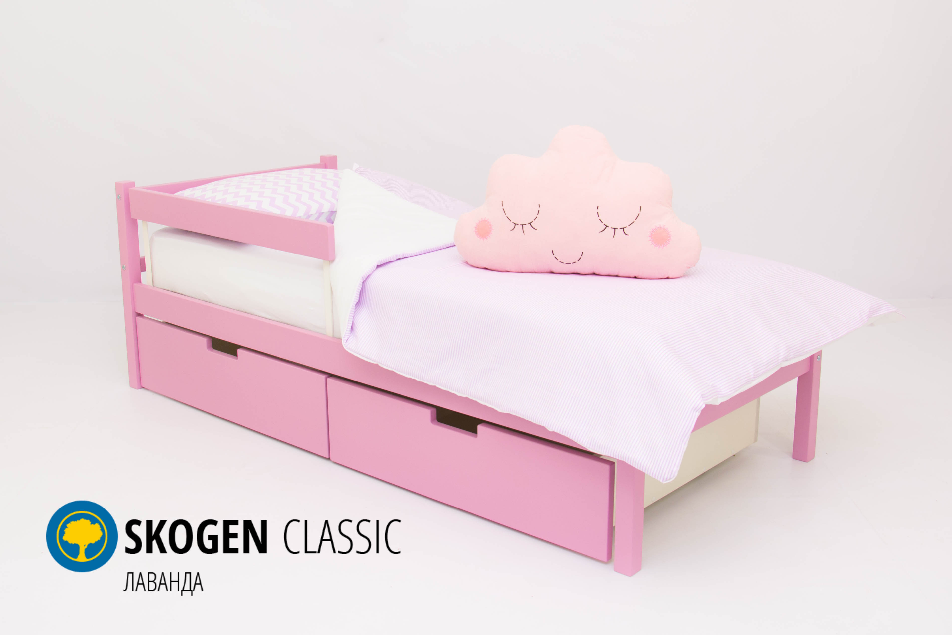 Экологически безопасный материал из натуральной сосны, соответствующий всем ГОСТовым нормам, не только безопасен для ребенка, но и отличается долговечностью, прост в эксплуатации и влагостоек, а дополнительный низкий бортик не только не даст маленькому непоседе выпасть из кроватки во время сна, но и позволит ему самостоятельно забираться в кроватку. Снизу могут располагаться два вместительных ящика для размещения постельного белья или же детских игрушек (комплект ящиков является дополнительным аксессуаром и не входит в стандартную комплектацию). Кроватка «Skogen» оснащена простой инструкцией по сборке, которую можно осуществить в течение 10 минут.