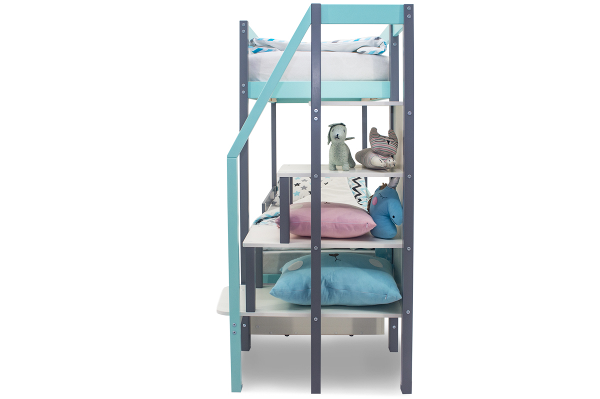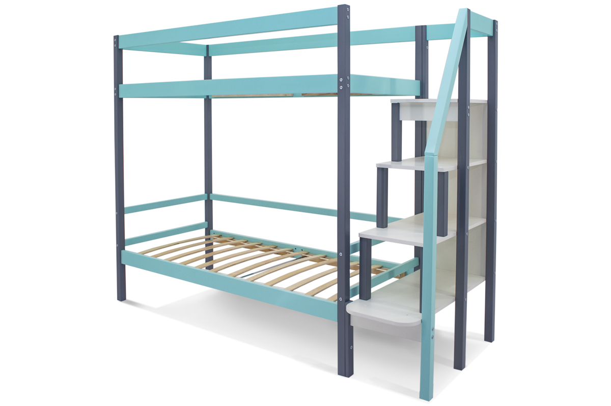 Кровать оборудована практичной лестницей-стеллажом. Полки лестницы можно использовать для игрушек, книг, ночника. Лестницу легко зафиксировать как справа, так и слева от кровати, что очень удобно. На каждом ярусе установлено прочное ортопедическое основание из 12 лат. Спальное место выдерживает нагрузку до 200 кг.