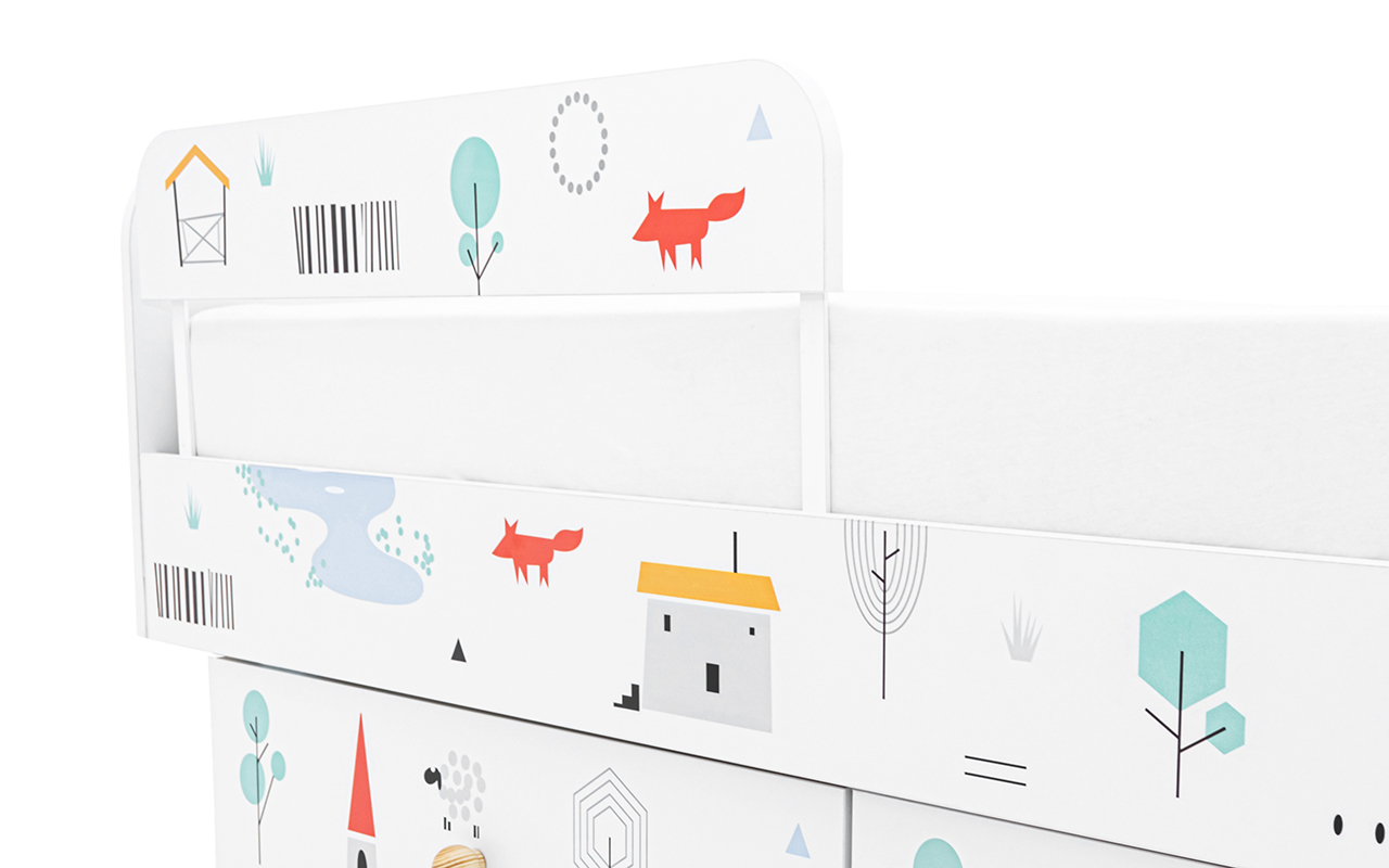 Бортик выполнен из ЛДСП класса Е1. На поверхность нанесен оригинальный рисунок ультрафиолетовыми высококачественными чернилами. Рисунок, нанесенный с помощью фотопечати устойчив к истиранию. Все материалы экологичны и безопасны. Крепежи из металла.