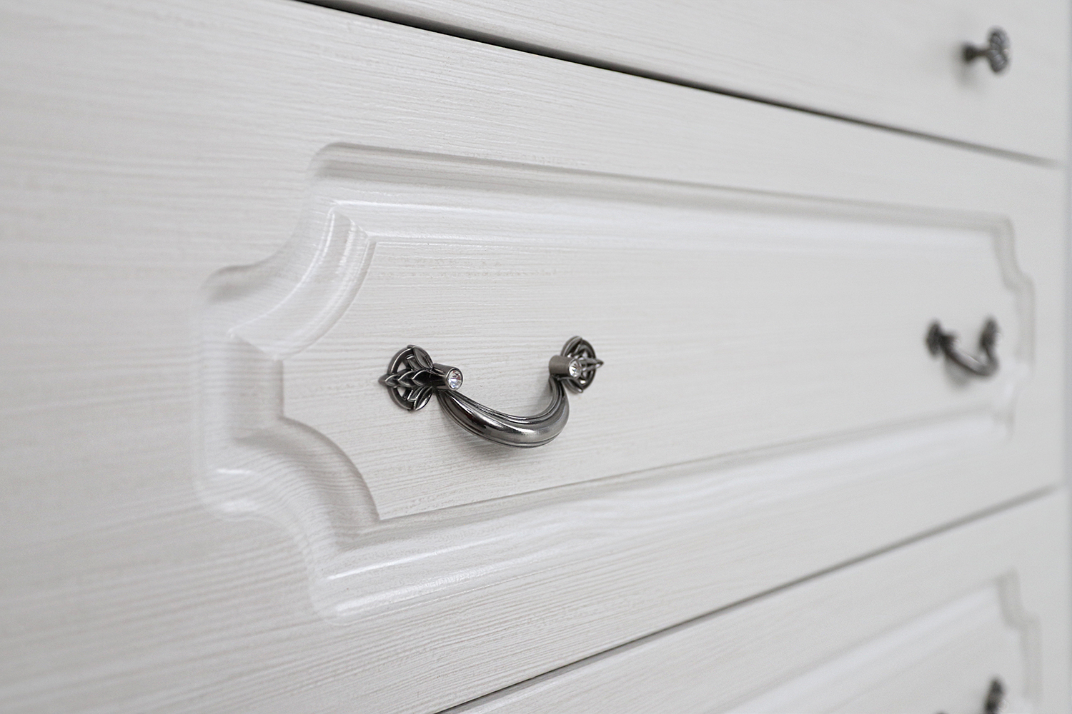 Резные детали на фасадах в сочетании со стилизованной под старину фурнитурой, придают комоду особый шарм прошлых веков.