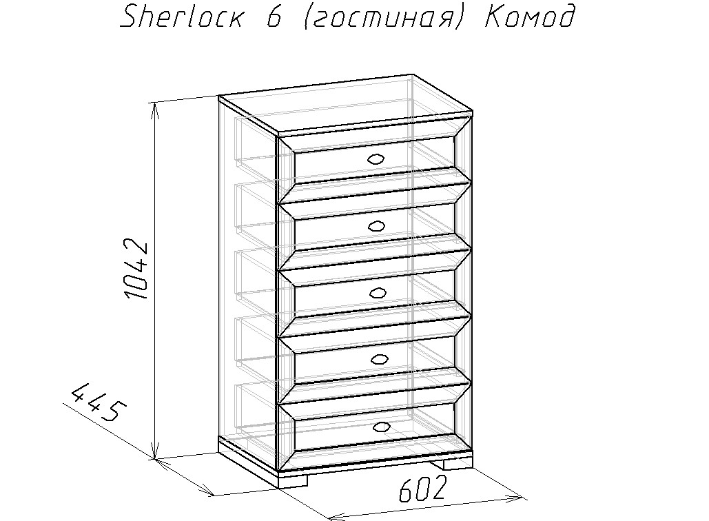 Высокий комод в спальню или в гостиную с пятью ящиками на шариковых направляющих позволит рационально использовать площадь комнаты. Повесьте над ним Шерлок зеркало 7 и эргономичный вариант для быстрого макияжа готов. Ящики глубиной 35 см, высотой 14 см, шириной 54 см выдерживают нагрузку до 20 кг каждый.