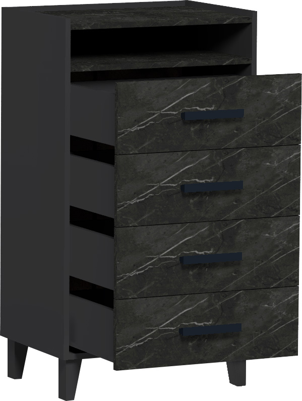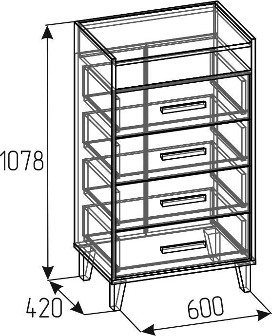 Рационально использовать пространство комнаты поможет высокий Айрис 45 Комод с нишей и 4 вместительными ящиками на шариковых направляющих. Ящики выдерживают нагрузку до 10 кг каждый. Высота опор 120 мм