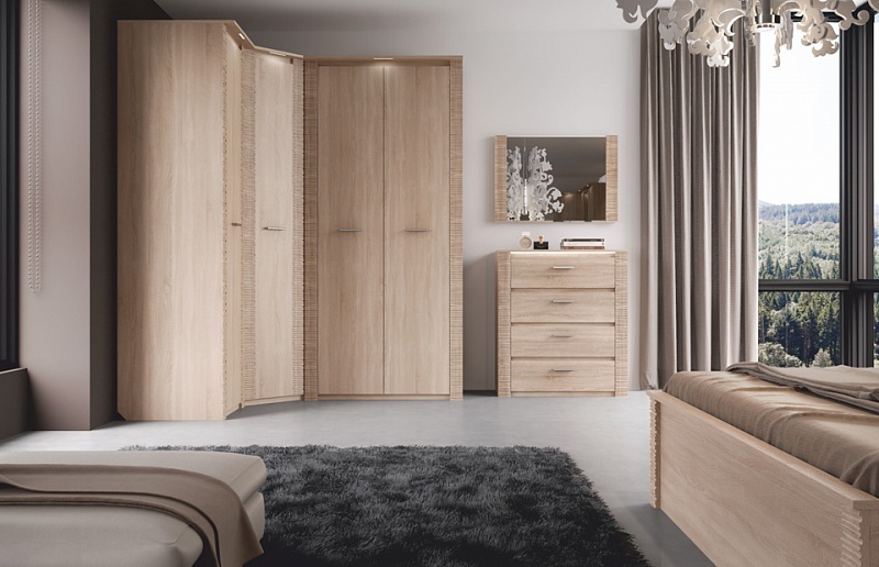 Данная модель, выполненная из ЛДСП и МДФ, входит в состав спального гарнитура "Элана".
