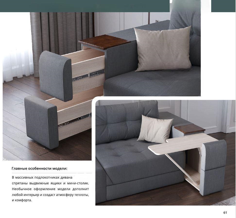 Прямой диван "Альянс-Б" имеет формованные подушки с утяжкой. Дополнительная опора защищает спинку дивана от провисания. В массивных боковинах спрятаны выдвижные ящики и небольшой столик.