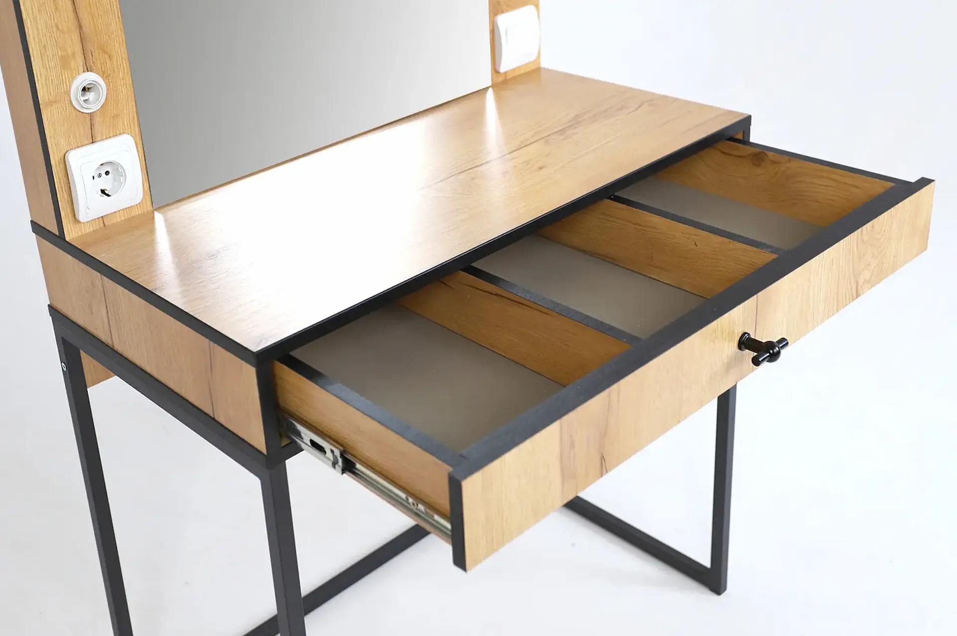 Трюмо «Берген 2» имеет опоры из металлической профильной трубы, вместительный ящик с тремя отсеками для мелочей и большое зеркало с фацетом.