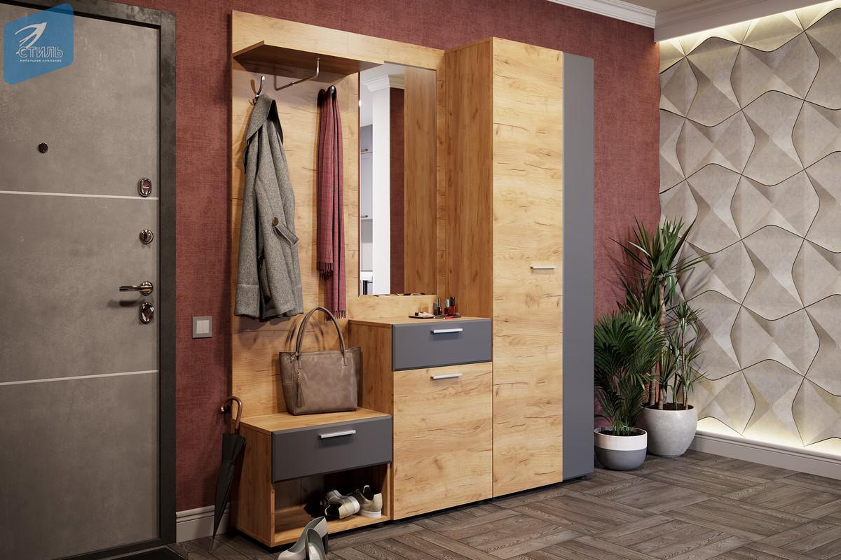 Прихожая обладает элегантным дизайном, сочетающим изысканность цвета и фактур корпуса и фасадов яркого «Дуб Крафт золотой» и мягкого «Графит СОФТ».