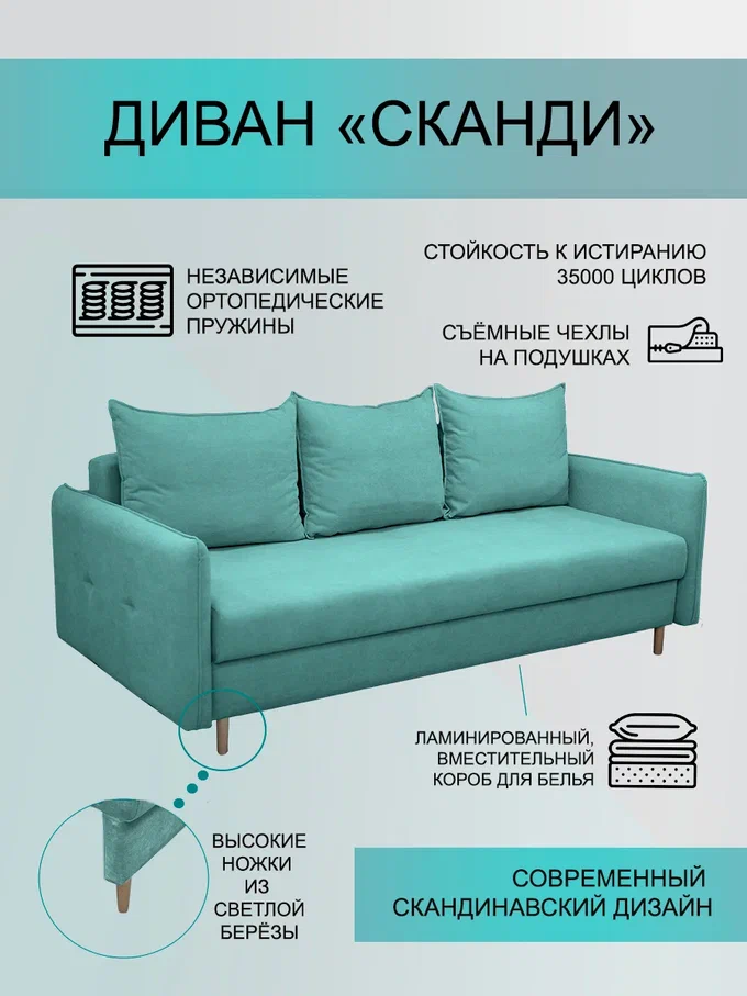 Стильный аккуратный диван на светлых ножках идеально впишется в ваш интерьер и станет его украшением. Подчеркнутый минимализм форм в сочетании с высококлассной тканью делают диван безусловной точкой притяжения в вашем пространстве. Помимо шикарного дизайна модель "Сканди" обладает большим спальным местом. Благодаря ортопедическим пружинам средней жесткости вы сможете использовать диван в качестве удобной кровати. Диван оснащен современным механизмом "тик-так" ( "пантограф") для плавного и лёгкого раскладывания. Высокие ножки (12см) открывают легкий доступ для уборки поддиванного пространства - мечта хозяйки. Сборка дивана производится за 5 минут и не требует специальных навыков. Желаем вам комфортного пользования!