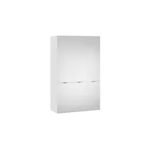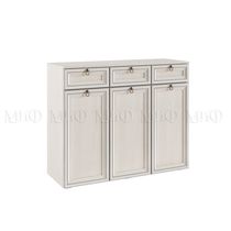 Элегантный трехстворчатый шкаф с центральной зеркальной распашной дверцей и с двумя распашными боковыми дверцами, декорированными лаконичной фрезеровкой. Карниз входит в комплект. В основании шкафа - низкие опоры. Наполнение - полки для белья и стационарная штанга.