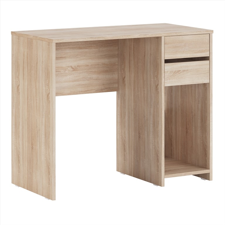 Односторонняя сборка. Толщина ЛДСП 16 мм. Кромка 0,4 мм (ПВХ). Отсутствие лицевой фурнитуры, фасад длиннее каркаса ящика и выполняет роль ручки. Стол имеет два выдвижных ящика на роликовых направляющих и одну открытую нишу высотой 45 см. Дно ящиков выполнено из ЛДВП. Устанавливается на пластиковые подпятники.