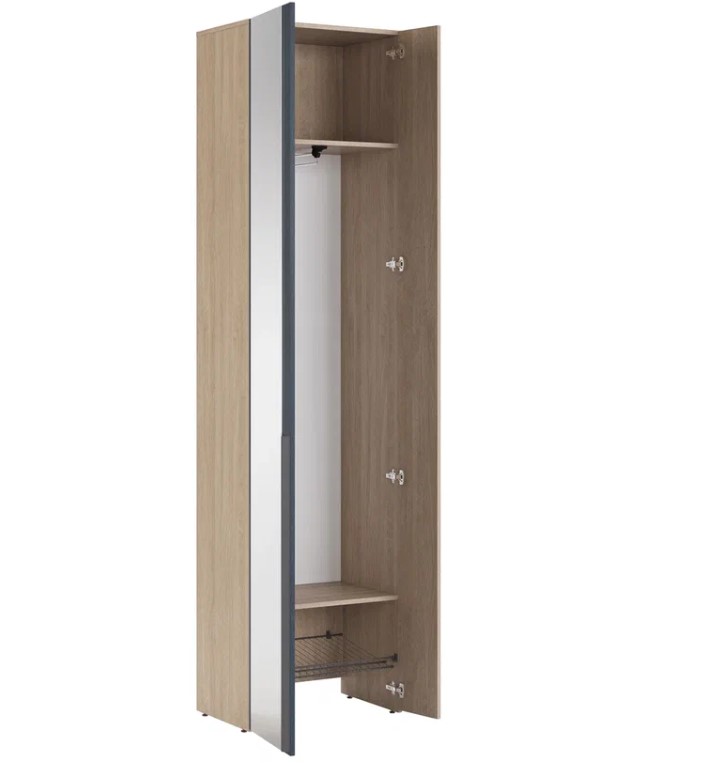 Возможна левосторонная и правосторонняя навеска фасадов. Толщина ЛДСП 16 мм. Кромка 0,4 мм (ПВХ). Ручка накладная длинная 974мм, выполнена из ПВХ пластика, окрашенного краской графитового цвета. Шкаф имеет два распашных фасада, на одном из фасадов приклеено зеркало. Для крепления фасадов используются европейские четырехшарнирные петли фирмы Titus (Словения) с доводчиком. Шкаф имеет три отделения. Отделение для хранения верхней одежды комплектуется выдвижной штангой. Нижнее отделение укомплектовано металлической сетчатой полкой, окрашенной полимерной антисколовой краской графитового цвета. Задние стенки ЛДВП накладные. Модуль стоит на регулируемых подпятниках. Рекомендуется крепление шкафа к стене.