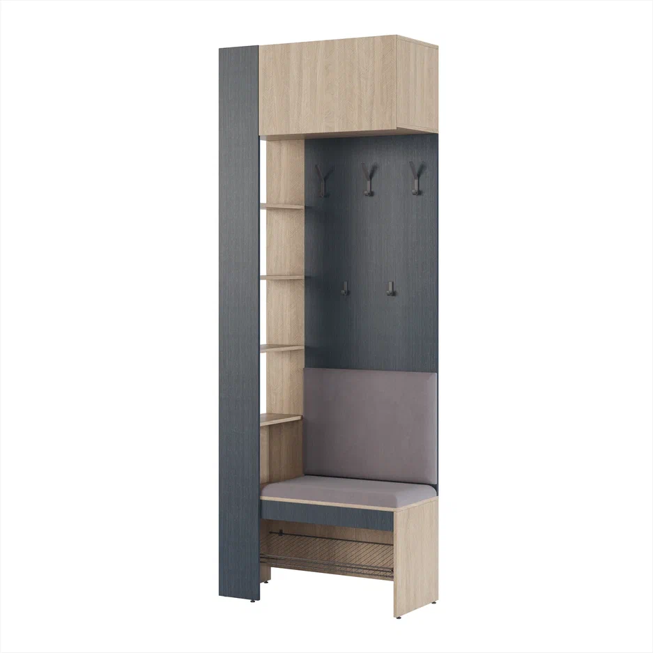 Возможна левосторонная и правосторонняя сборка. Толщина ЛДСП 16 мм. Кромка 0,4 мм (ПВХ). Крючки и сетчатая полка изготовлены из металла, окрашенного полимерной антисколовой краской графитового цвета. Вешалка имеет антресольную секцию, открывающуюся при помощи газ.лифтов и петель европейской фирмы Titus (Словения), секцию для открытого хранения с полками, секцию с крючками и мягким сиденьем, обитым велюром цвета "Light grey". В нижней нише имеется сетчатая полка для обуви. Модуль стоит на регулируемых подпятниках. Крепится к стене.