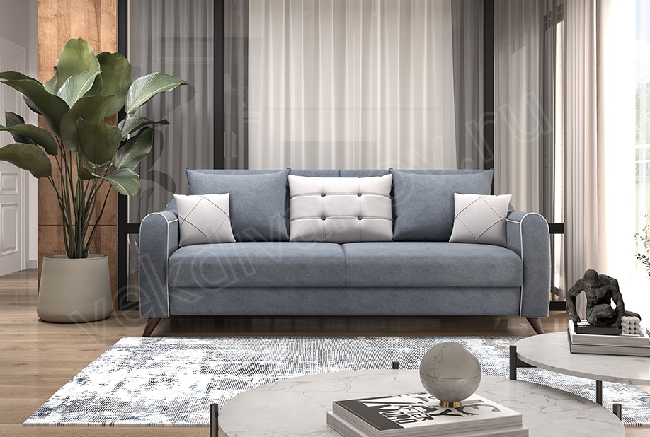 Отличительные особенности: Яркая интересная модель с возможностью трансформироваться в удобное спальное место. Элегантный вид модели придают контрастные акценты: двухсторонние подушки спинки, декоративные пуговицы на боковинах и центральной подушке спинки, отделка шнурообразным кантом, декоративные подушки с отстрочкой, стильные высокие ножки.