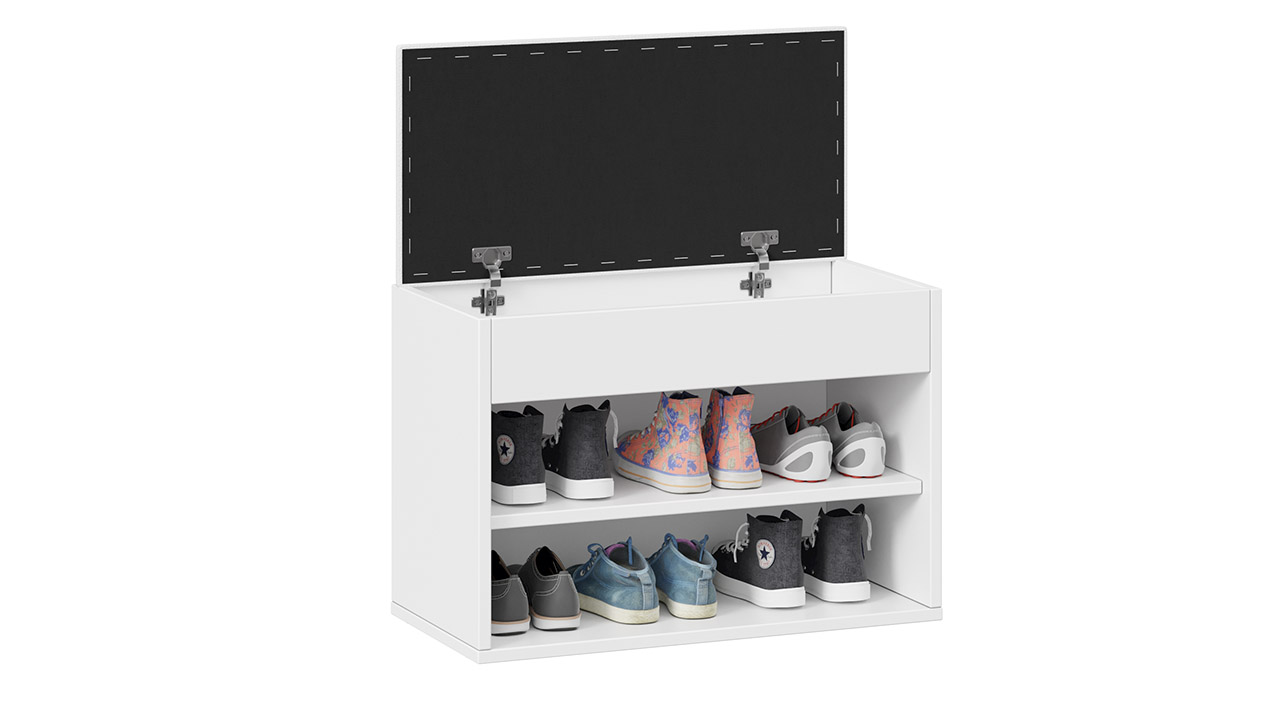 Тумба для обуви имеет открытую нишу для бережного хранения обуви и место под откидной крышкой. Данное пространство можно использовать для хранения обувных аксессуаров и различных мелочей, что без сомнений является преимуществом новинки.
