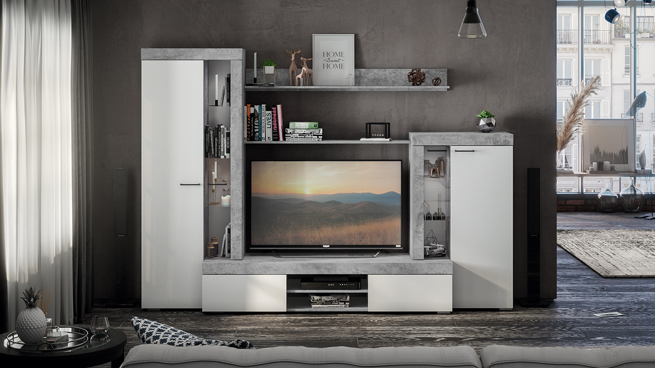 Декор. Сочетание белых фасадов, черной лицевой фурнитуры и каркасов в текстуре «Цемент светлый» способно освежить и преобразить комнату, придать интерьеру вашей гостиной современный, благородный вид.
