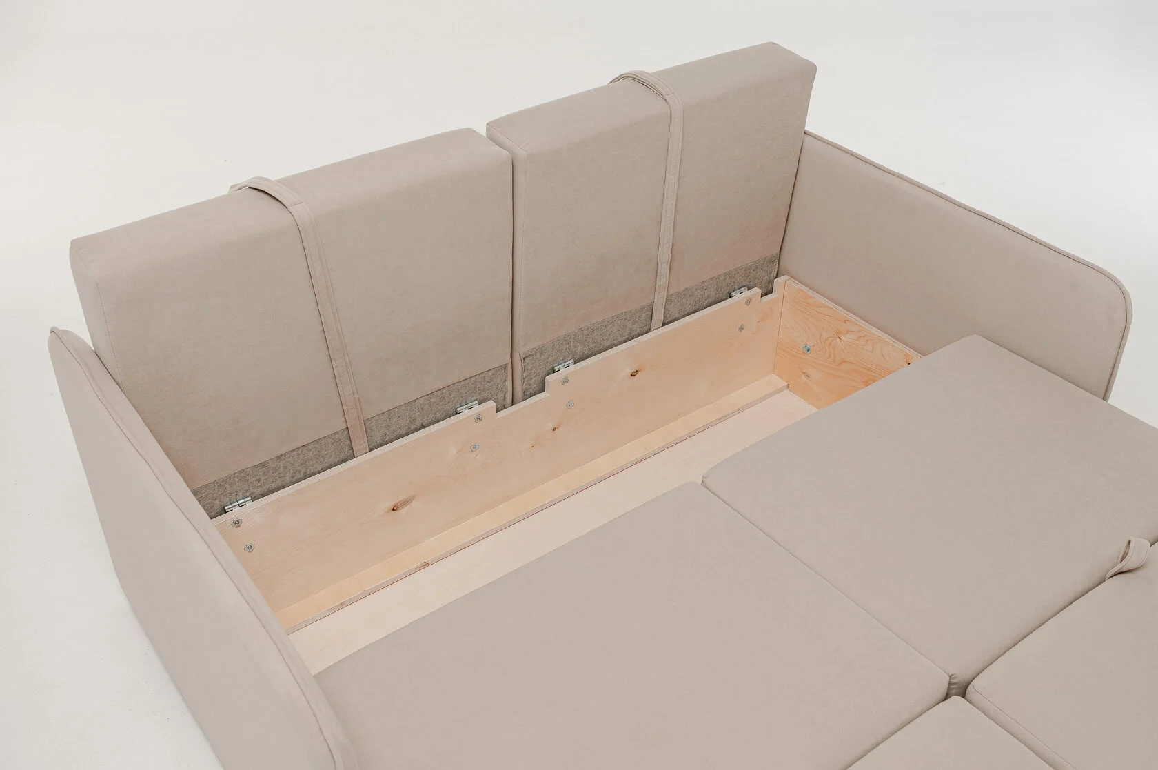 В компактном диване уместились ящики для белья. Пластиковые подпятники предотвращают царапанье напольного покрытия, обеспечивают удобство перемещения.
