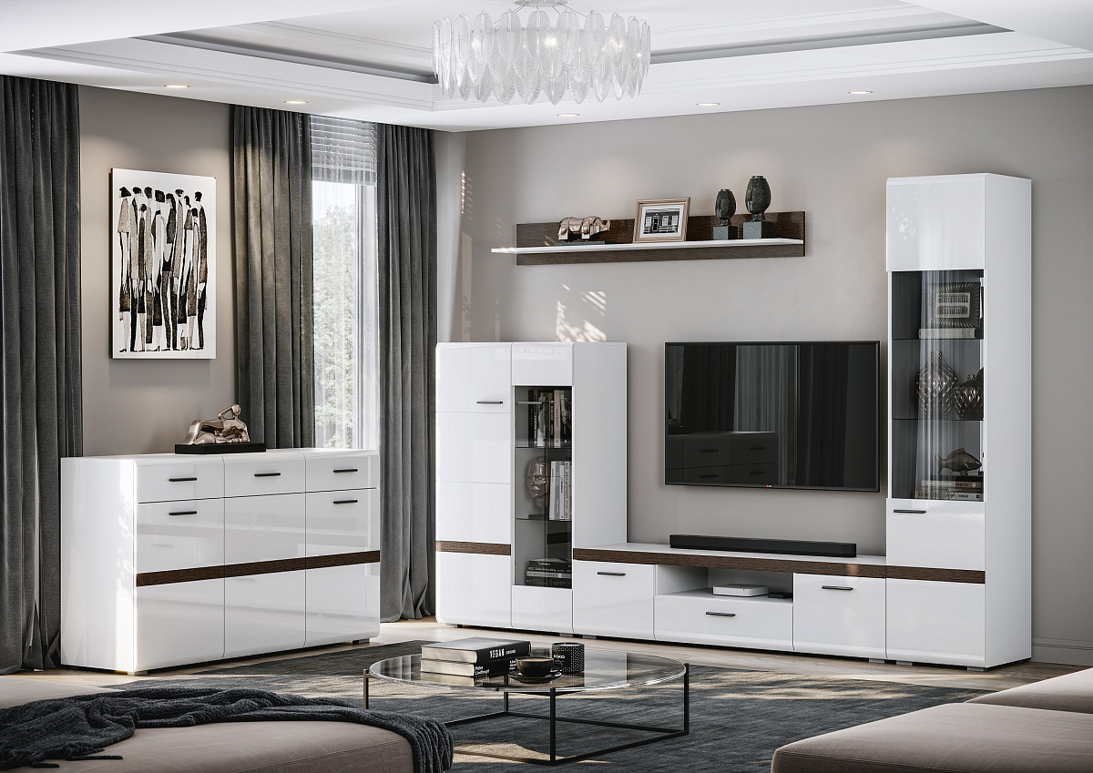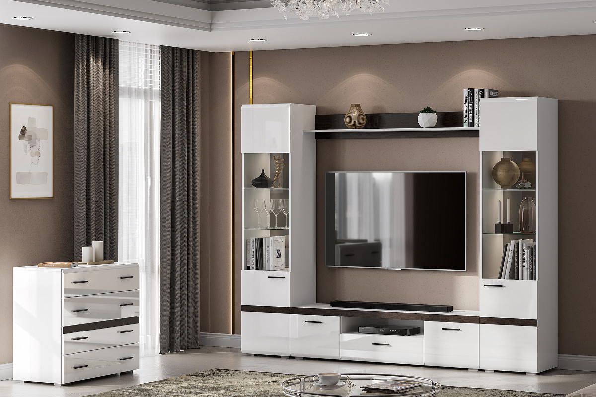 Задняя стенка полки изготавливается из ЛДСП "Дуб Венге", непосредственно сама полка из ЛДСП "Белый". Полка навешивается на стену при помощи регулируемых, врезных навесов "Hafele". Крепеж в стену в комплектацию не входит.