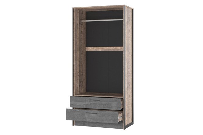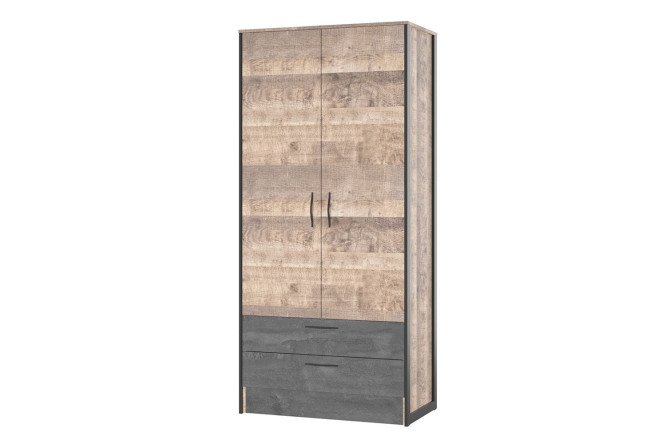 Двухдверный шкаф Hugo наверняка понравится поклонникам необычных интерьерных решений. Лаконичная по форме модель привлекает внимание оригинальной расцветкой с эффектным сочетанием оттенков и текстур. Теплоту декора под дерево подчеркивают черная отделка углов и фасады ящиков под темный камень. Шкаф компактен и при этом вместителен и удобен. В нем есть место и для развешивания одежды на плечиках, и выдвижные ящики, в которых удобно хранить документы. аксессуары и все те мелочи, которые имеют обыкновение теряться в самый неподходящий момент.