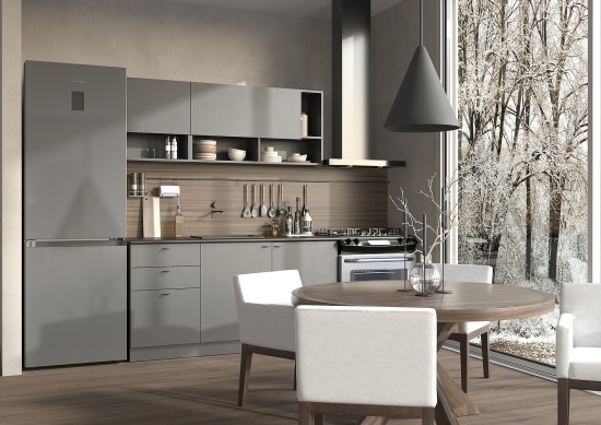 Верхняя группа гарнитура состоит из двух независимых модулей, изменение последовательности размещения которых меняет геометрию и функциональность. Первый модуль шириной 500 мм с распашной створкой на петлях и открытой нишей, высотой 20 см. Открытие створки осуществляется за выступающий ниже промежуточной вязки фасад. Партнером верхнего модуля шириной 500 мм в части нижнего модуля является разделочный стол с тремя выкатными ящиками. Два верхних ящика небольшой глубины и нижний большой позволяют обеспечить хранение кухонной утвари разных габаритов. Второй навесной шкаф шириной 1100 мм с боковыми и нижними открытыми Г-образными нишами имеет закрытый створкой на газлифтах отсек шириной 900 мм. Такие габариты закрытого шкафа дают возможность разместить столовый сервиз из огромного количества предметов. Боковая открытая ниша шириной 20 и высотой 40 см удобна для ваз, бутылей и иных высоких кухонных предметов. По нижним открытым нишам могут уютно расположиться чашки, кружки, банки и специи. Нижним партнером этого модуля является разделочный стол шириной 1100 мм, конструктив которого включает в себя секцию под мойку шириной 550 мм и секцию с полкой. Фасады комбинированного стола распашные. Стол имеет универсальную сборку, позволяющую установить в удобном месте мойку.