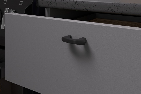 Кухонный гарнитур Энни 1,6 покрыт цельной черной столешницей толщиной 26 мм. В случае, если возникает необходимость между столами и верхними шкафами разместить бытовую технику, необходимо распилить столешницу на длину 500 мм и 1100 мм, закрыв открытые спилы торцевыми планками для 26-ой столешницы. Кухонные столы устанавливаются на регулируемые пластиковые опоры с клипсами для цоколя. Комплектация каждого стола подразумевает наличие цоколя-партнера длиной, равной длине стола.
