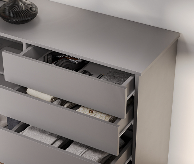 Комод шириной 1100 мм в своем контруктиве предусматривает 4 выкатных ящика разной глубины, позволяющих систематизировать хранение вещей и предметов по габаритам, и полочное провтранство за распашной створкой. Открытие всех фасадный частей осуществляется боковым захватом пальцами. Выкатные ящики шириной 600 мм открывают вместительное пространство, между ящиками и распашной створкой шириной 400 мм открытая зона полки, позволяющая разместить интерьерные декоры. Комод установлен на цоколь, на нижней части которого монтируются мебельные подпятники, защищающие напольное покрытие от истирания.
