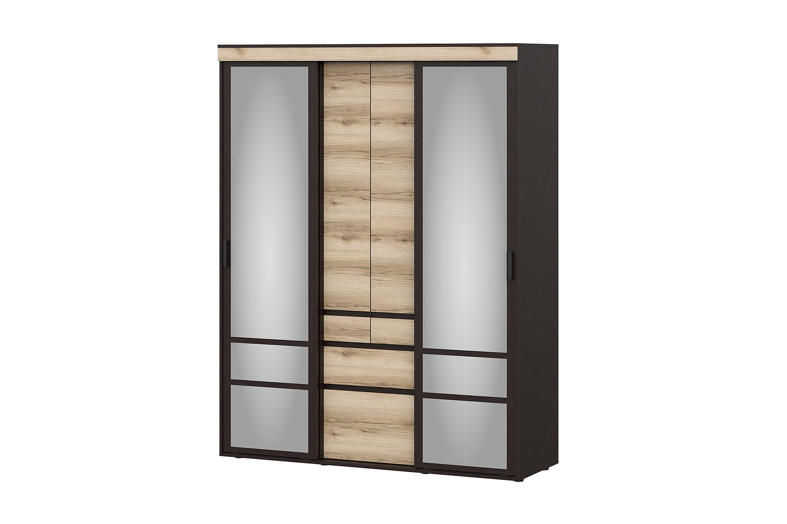 Шкаф-купе Берген декорирован серебряными зеркалами и оснащен двумя боковыми откатными створками. Материал ЛДСП, цветовое исполнение дуб делано/венге.