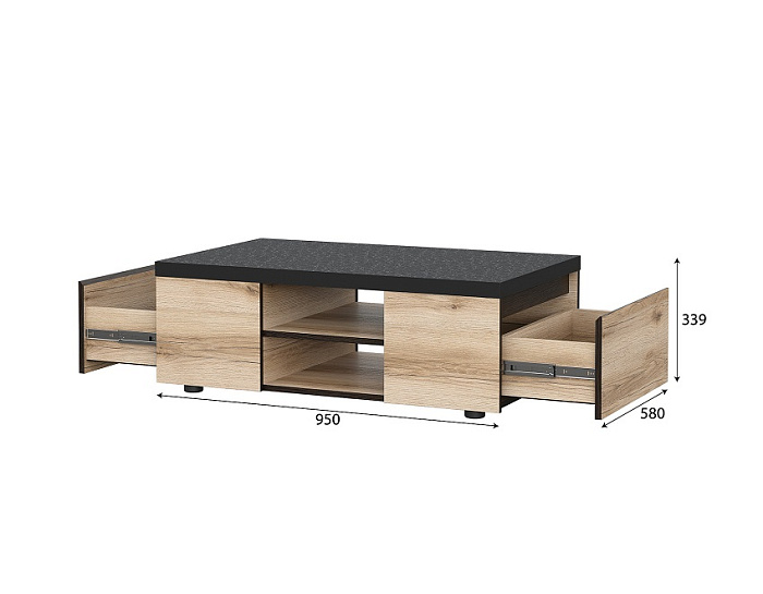Стол с двумя объемными выкатными ящиками на шариковых направляющих, массивной черной столешницей толщиной 38мм и котрастным кромлением открытых полок.