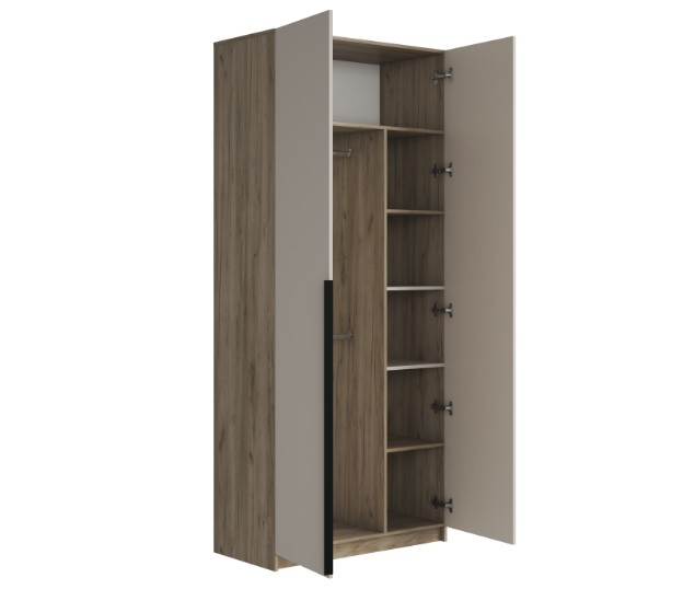 Шкаф имеет антресольную полку (высота 370 мм) и оставшееся снизу неё пространство, поделённое перегородкой на: