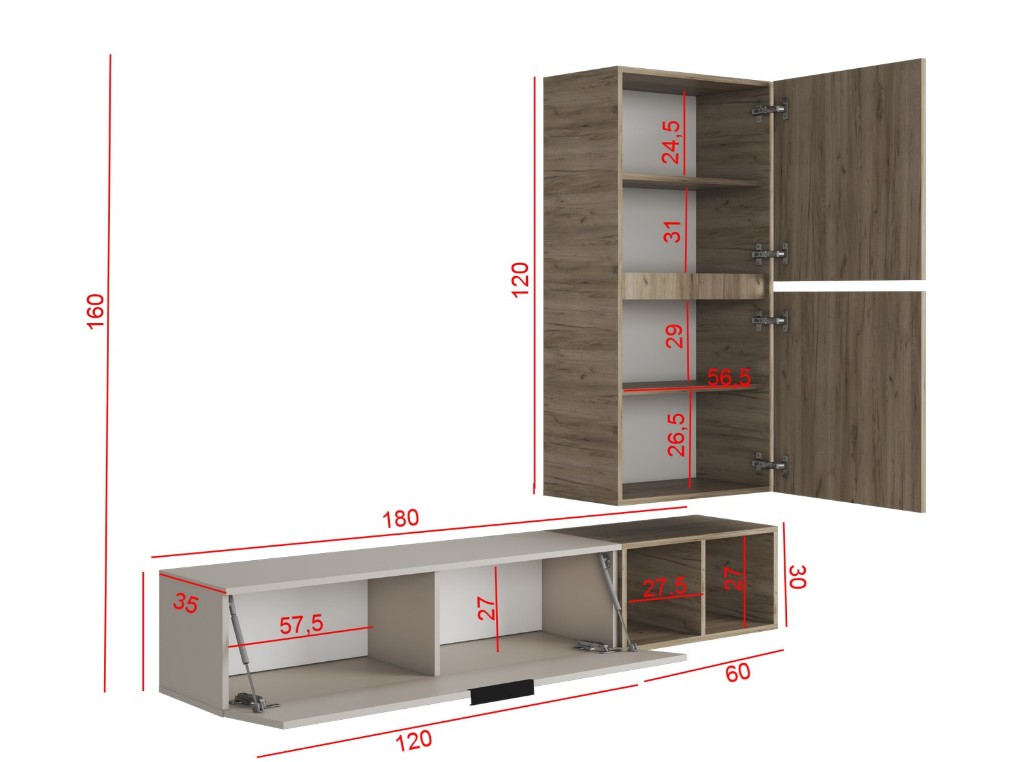независимых модулей: навесного шкафа с 2-мя глухими фасадами, тумбы навесной и открытой