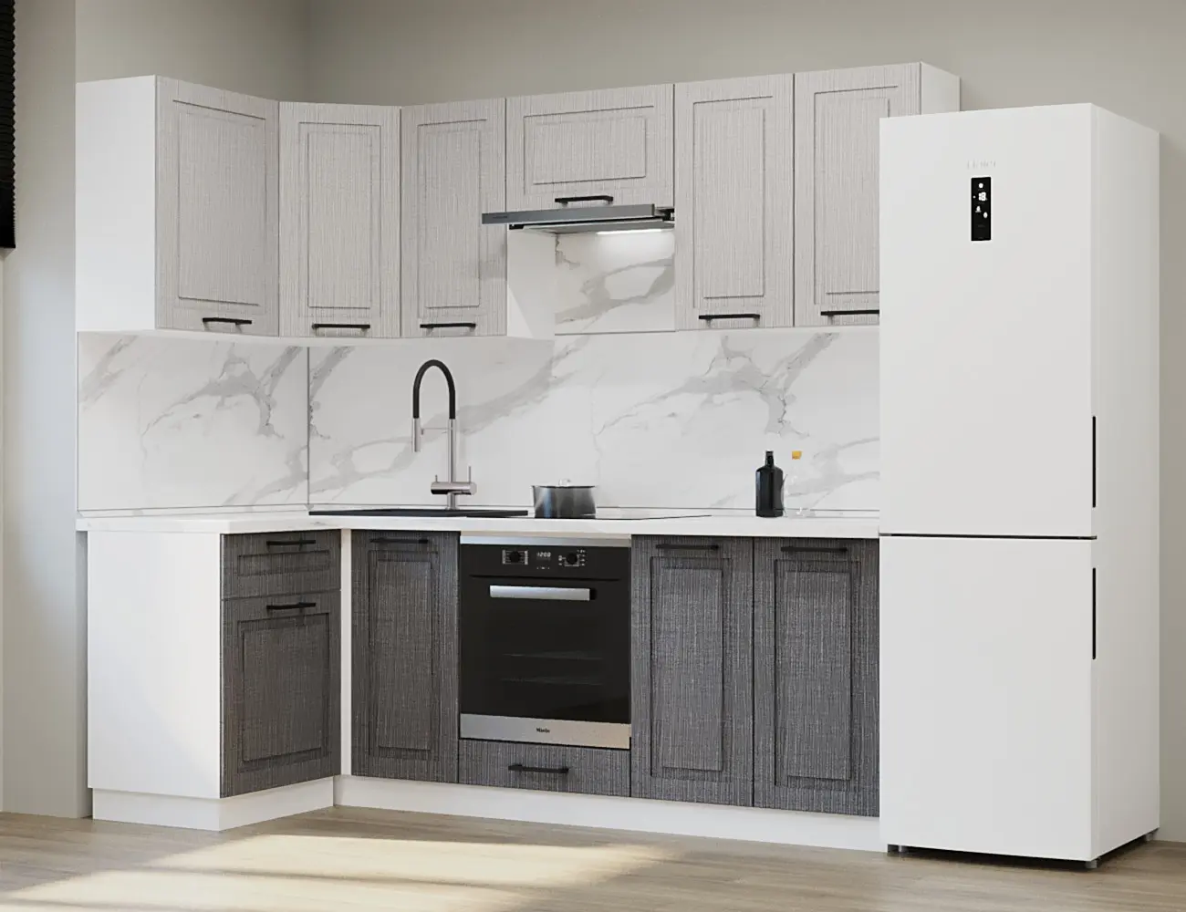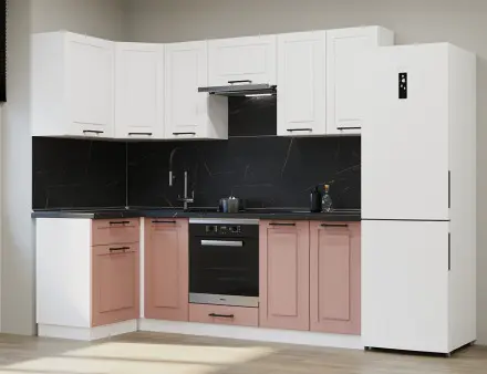 Аликанте 9: Цвет фасада: Шарли Pink, Шарли белый, корпус Серый, столешница 28мм: Каспий черное золото