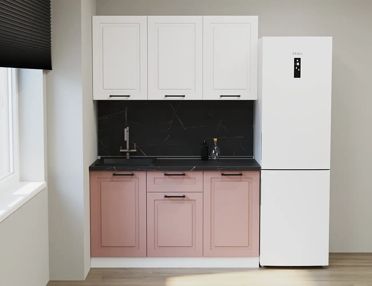 Аликанте 11: Цвет фасада: Шарли Pink, Шарли белый, корпус Серый, столешница 28мм: Каспий черное золото