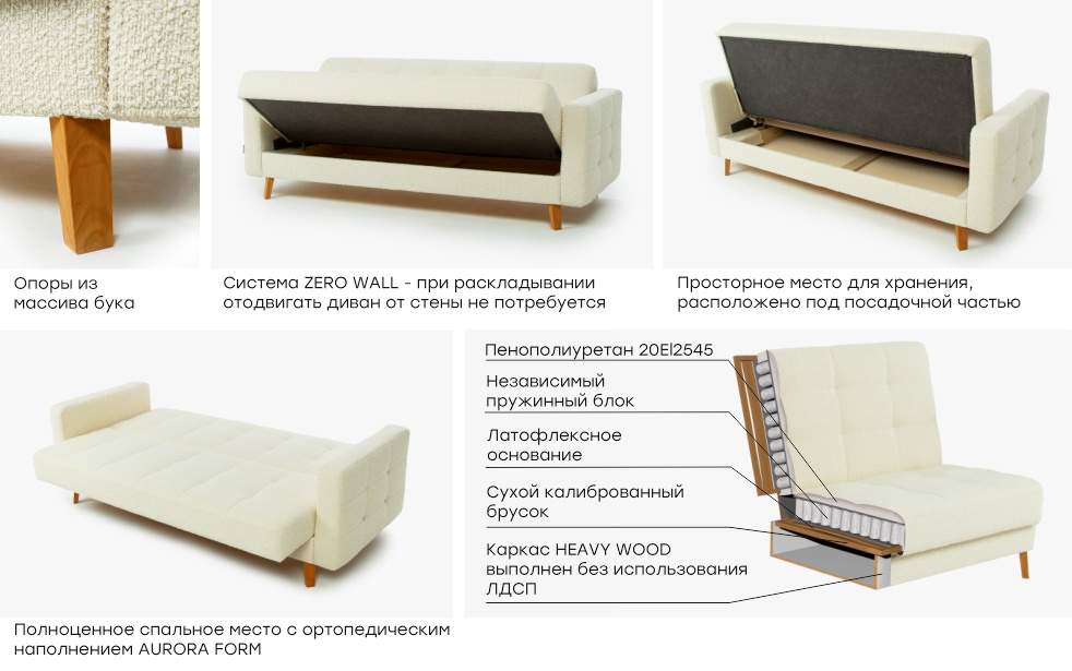 С помощью механизма «книжка» вы сможете легко и быстро разложить диван в кровать. С помощью системы ZERO WALL при раскладке отодвигать диван от стены не потребуется. С ортопедическим наполнением AURORA FORM ваш сон будет комфортным и здоровым. Надежный каркас HEAVY WOOD выполнен без использования ЛДСП. Уникальная система SOFT LINE не только придает визуальный стиль, но и обеспечивает пышность и мягкость форм, минимизируя растяжение ткани.