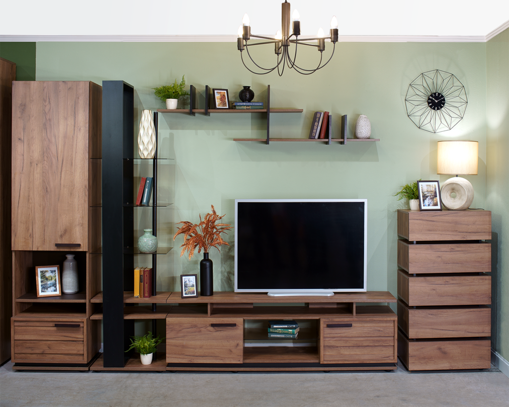 Стильная и аккуратная тумба приятного древесного оттенка гармонично впишется в интерьер гостиной в стиле Лофт. Визуально легкая конструкция не загромождает пространство и делает его более функциональным. Комбинированный вариант открытых полок со шкафчиками с глухими фасадами отлично подойдет для размещения многочисленной видеоаппаратуры, дисков и журналов. Благодаря вытянутой форме тумбы на ней без труда поместится телевизор с диагональю до 60'', а две удобные распашные дверцы позволят убрать от посторонних глаз личные вещи.