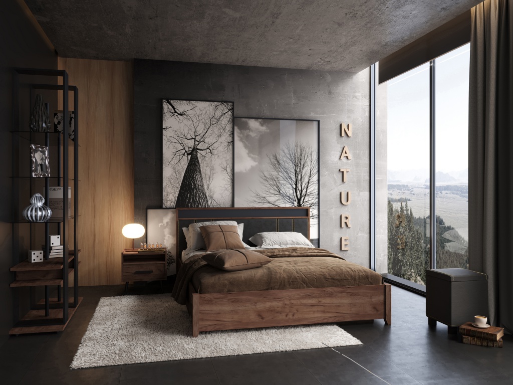 Двуспальная кровать NATURE 307 Кровать Люкс с подъемным механизмом  станет стильным дополнением для вашей спальни. Спокойный и расслабляющий древесный декор кровати  поможет создать атмосферу настоящего уюта и комфорта в комнате. А контрастные вставки из ЛДСП и декоративные золотые нити на черной экокоже сделают изголовье кровати более интересным и современным. Экокожа очень легко чистится и не выгорает под воздействием солнечных лучей.