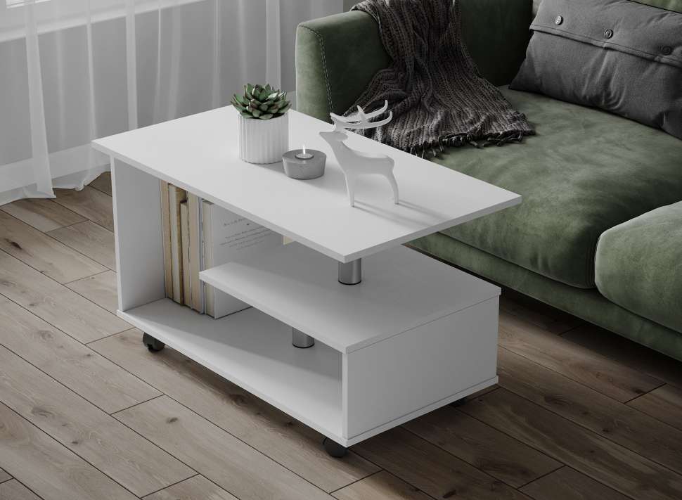 Журнальный стол имеет дополнительную вставку-полку, что делает его необычным и привлекательным. Стильный внешний вид украсит любую гостиную.