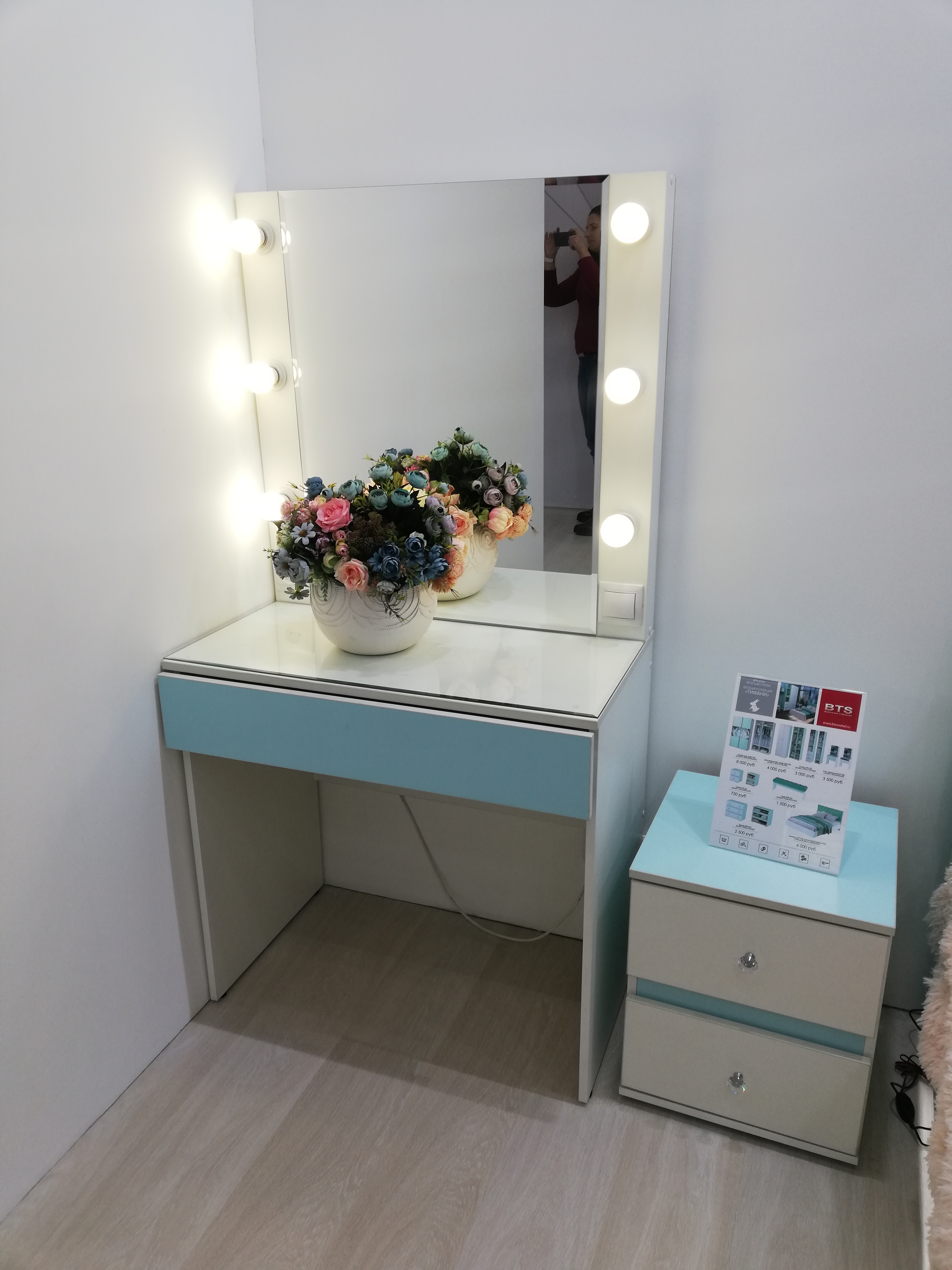 Туалетный столик "Тиффани" оснащен подсветкой по периметру, розеткой и выключателем. Изюминкой туалетного столика является съемное стеклянное покрытие столешницы с фацетной кромкой. Стол имеет вместительный выдвижной ящик.