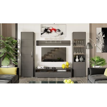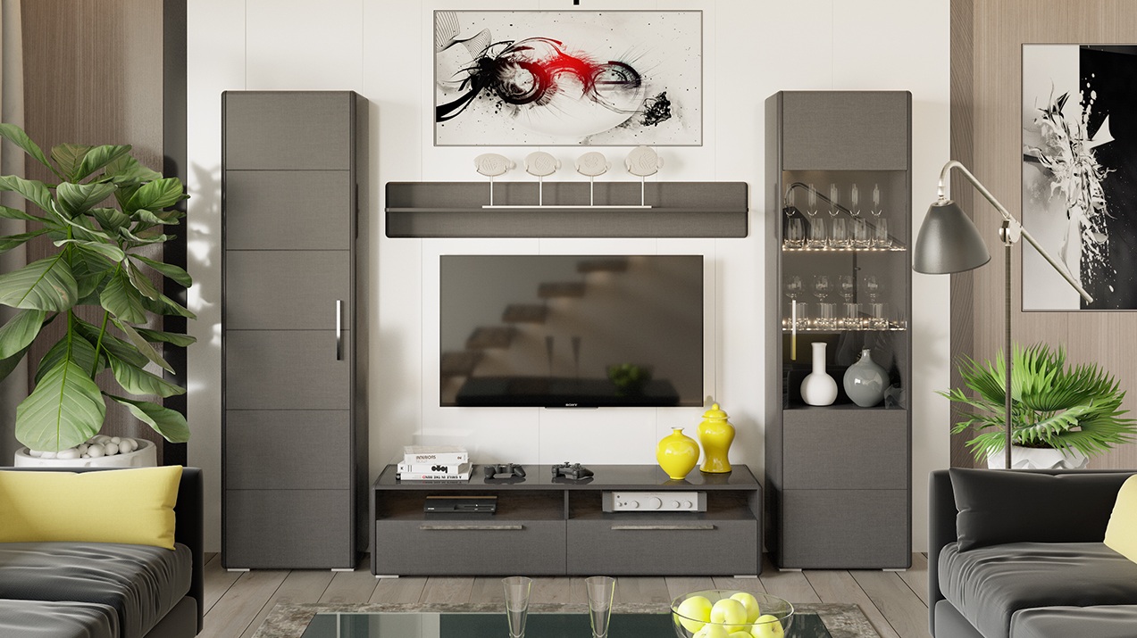 Стеклянные тонированные фасады и полки, сочетание элегантных глянцевых каркасов и красивого фасада текстуры "Джут" делает вид гостиной завершенным и эстетичным. Современный дизайн модели дополняет качественная лицевая фурнитура, которая придает дополнительную элегантность изделиям своей формой и сиянием хрома. Ножки-опоры шкафов и тумбы смещены под каркасы, что создает эффект парения в воздухе.