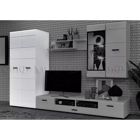 Изысканная, белоснежная с приятным блеском гостиная, несомненно украсит собой любую квартиру или дом. В гостиной есть все необходимые элементы для красивого оформления комнаты. Фасады с фрезеровкой и стеклянные витрины создают современный и стильный образ вашему дому.
